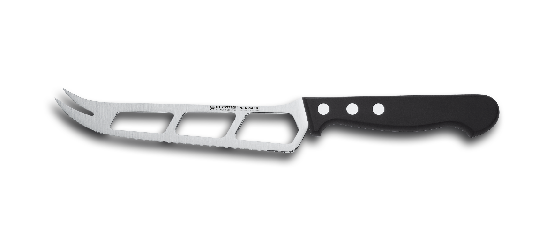 Das perfekte Messer für Käseliebhaber. Sie können Weichkäsesorten wie Brie, Camembert und Gorgonzola schneiden, ohne dass die Hälfte an der Klinge kleben bleibt. Das verhindern die großen Aussparungen. Dank des Sägeschliffs der 15 cm langen Klinge ist auch das Schneiden von Parmesan und anderen Hartkäsesorten kein Hindernis mehr. Mit der geteilten Messerspitze könne Sie die Käsestücke ideal aufnehmen.