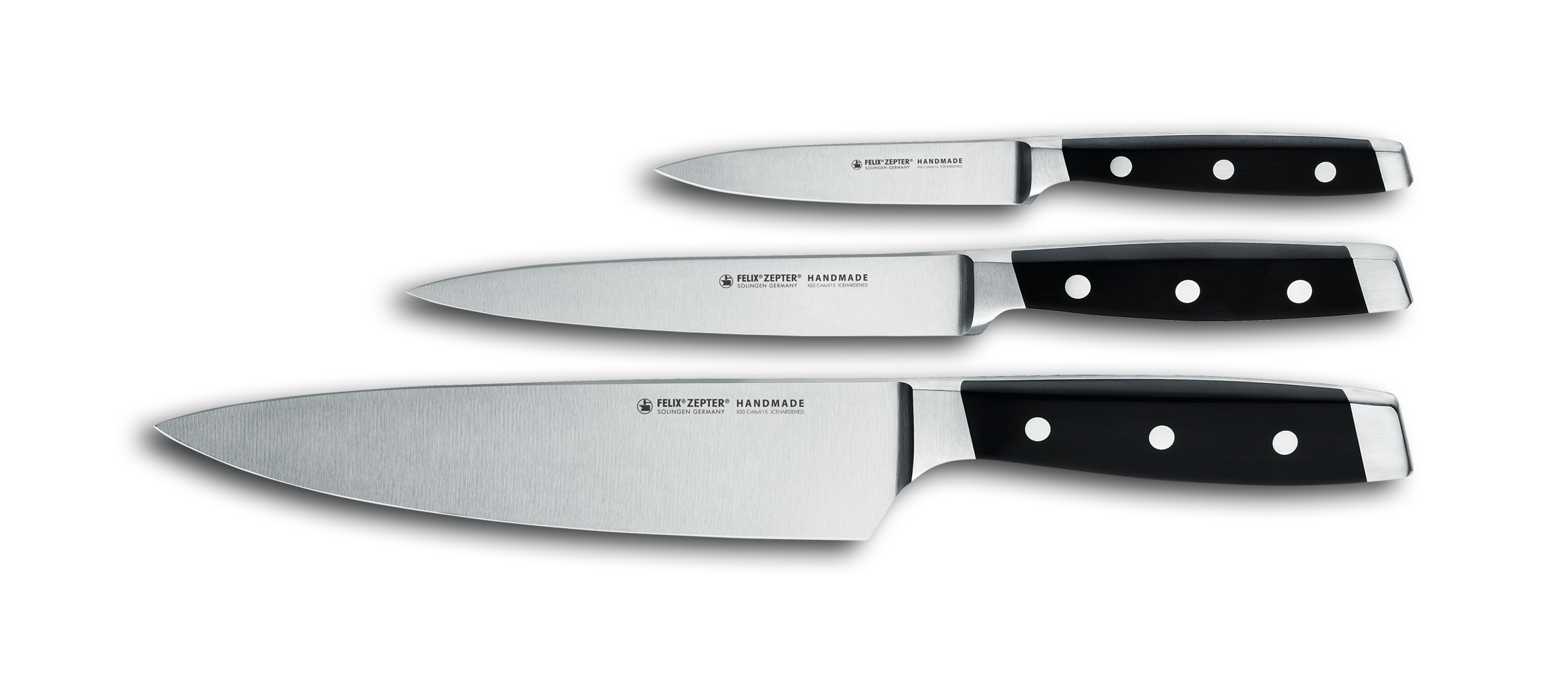 Das 3-teilige FIRST CLASS Messer-Set ist das perfekte Starterpaket. Das Spickmesser ist eine unersetzliche Hilfe in der Küche. Präzises Schneiden ist mit der 10 cm langen Klinge kein Problem. Ob Gemüse putzen, Obst schälen oder Fleischstücke verarbeiten – mit dem handlichen Spickmesser ist alles möglich. Auch das Zubereitungsmesser der Serie FIRST CLASS darf in keinem Haushalt fehlen. Es ist ein vielseitiges Allzweckmesser für den gehobenen Anspruch. Das FIRST CLASS Kochmesser ist ein Universalmesser. Das innovative, schlanke Klingendesign sieht nicht nur gut aus, es ermöglicht auch ein problemloses Schneiden von unterschiedlichsten Lebensmitteln. Die 21 cm lange Klinge wird auch mit größeren Fleischstücken fertig. Aber auch Gemüse und Fisch können mit dem Allrounder der Küche geschnitten und geputzt werden.