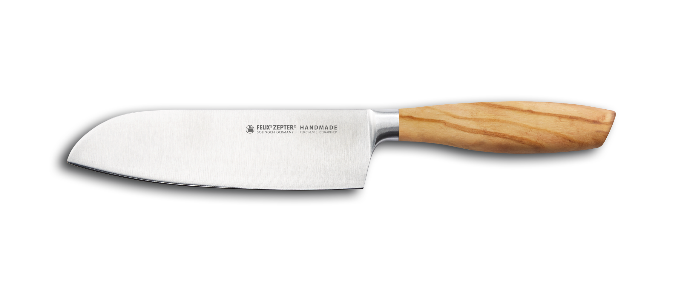 Das Santokumesser der Serie SIZE S Olive überzeugt durch sein traditionell japanisches Design. Besonders gut eignet sich das Messer zum Vorbereiten von Lachs, Schinken oder Gemüse. Hauchdünne Scheiben sind im Handumdrehen geschnitten. Dank der runden Warte können aber auch Kräuter fein gehackt werden.