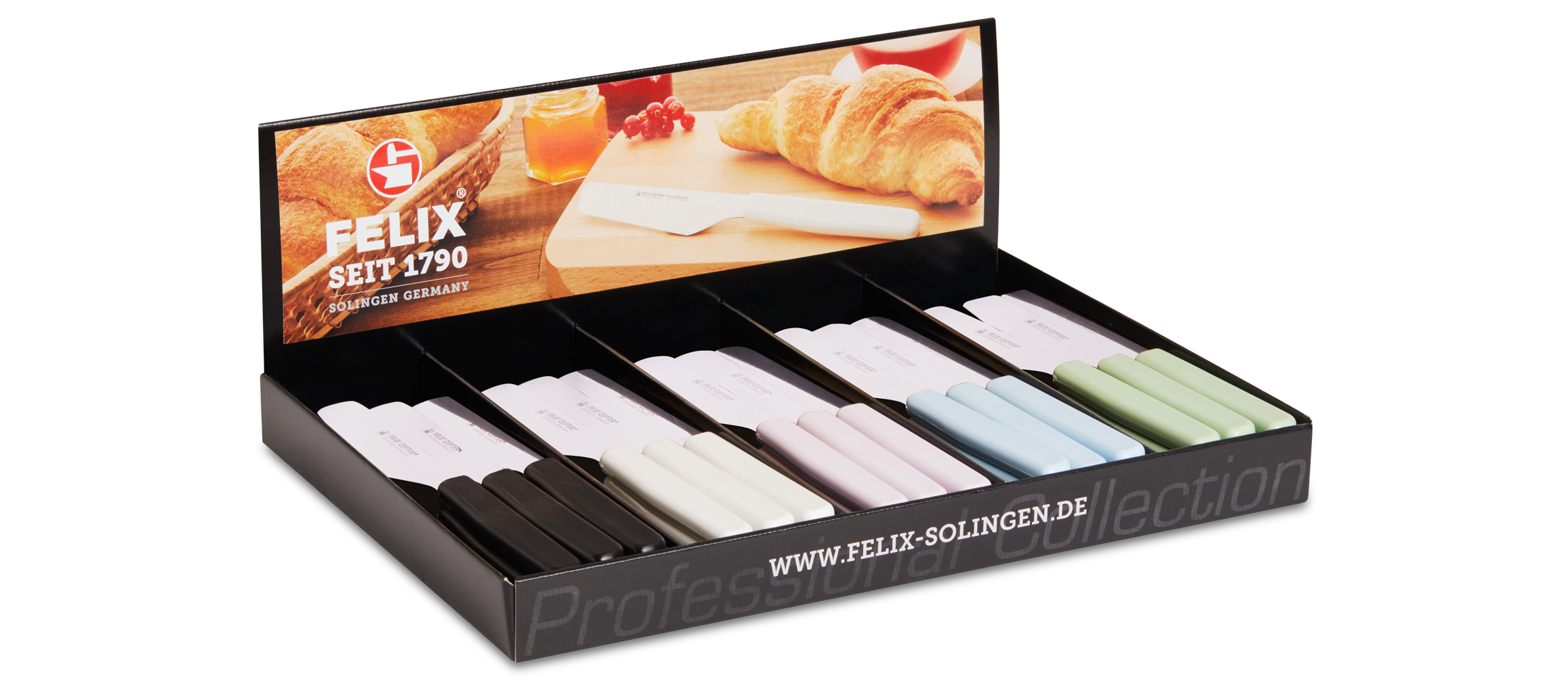 Die Felix - Brötchenmesser werden vor allem zum Aufschneiden von Brötchen, Kuchen oder Tomaten verwendet. Die Klinge schneidet krümellos, selbst die Brötchen vom Vortag. Die breite abgerundete Klinge eignet sich hervorragend zum Schneiden und Auftragen von Butter, Käse oder Wurst. Alles in allem der perfekte Allrounder.