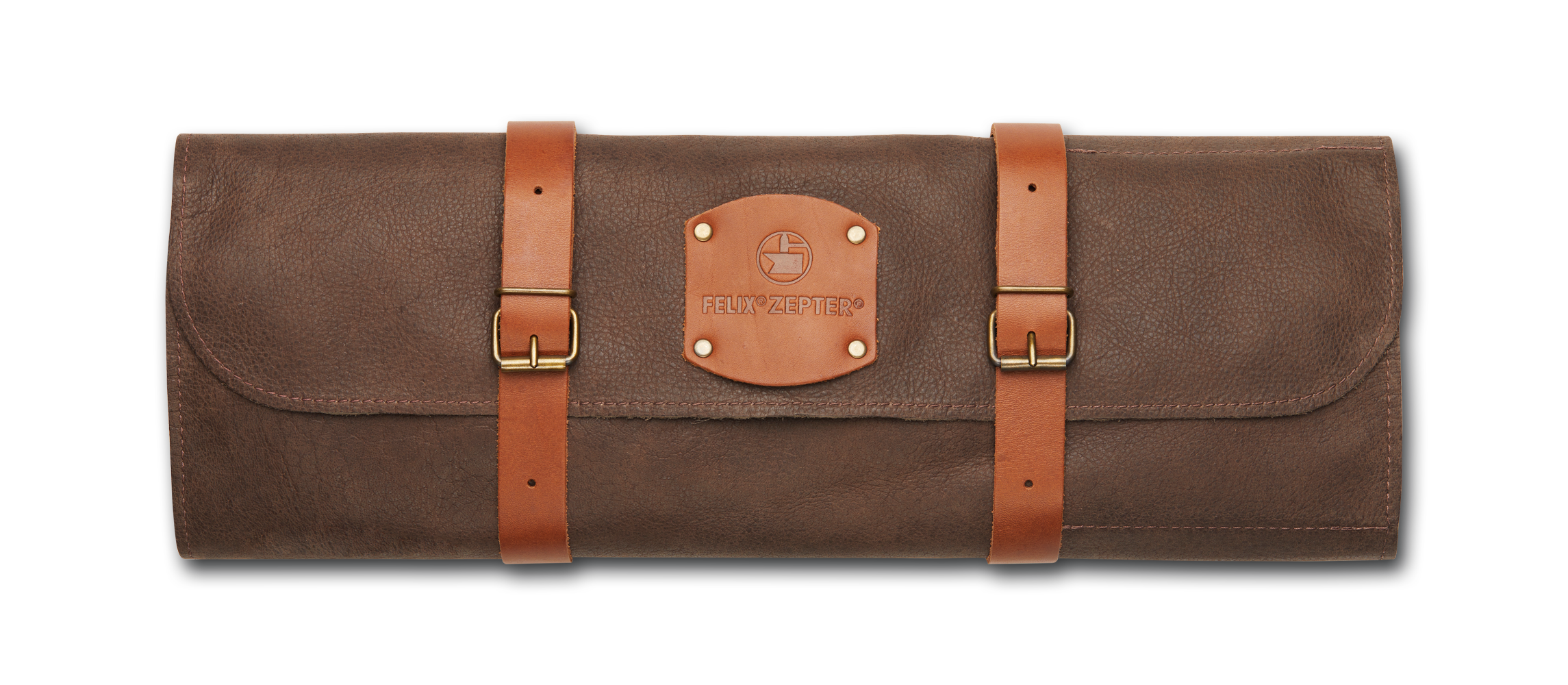 The perfect gift for all hobby and professional chefs. In this leather knife bag your knives are perfectly and safely stored. This bag made of soft cowhide leather offers space for 5 pieces. We recommend to provide the knives with a blade protection. When rolled up in the bag, it prevents mutual contact between the blades or scratching. For the care of the leather we recommend the treatment with some leather grease.